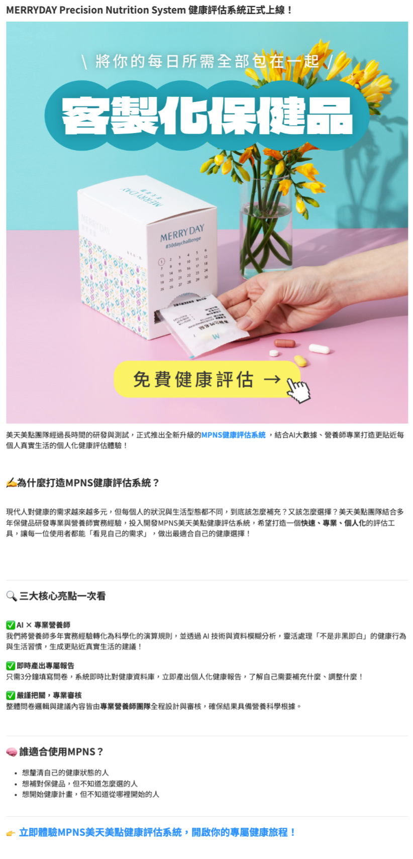 ● 標題關鍵字帶入:美天美點、MERRY DAY、專屬客製化保健食品、MPNS健康評估系統(*請發揮創意吸睛標題~)