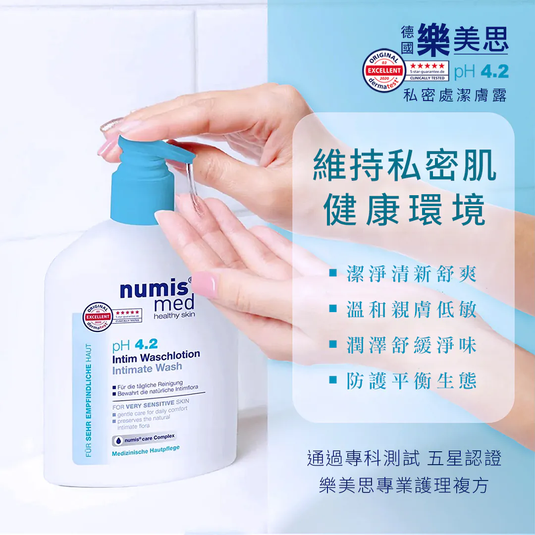 含有活性成分和泛醇的 numis® care Complex 的溫和配方,對私密區域的最佳 pH 值為 4.2。