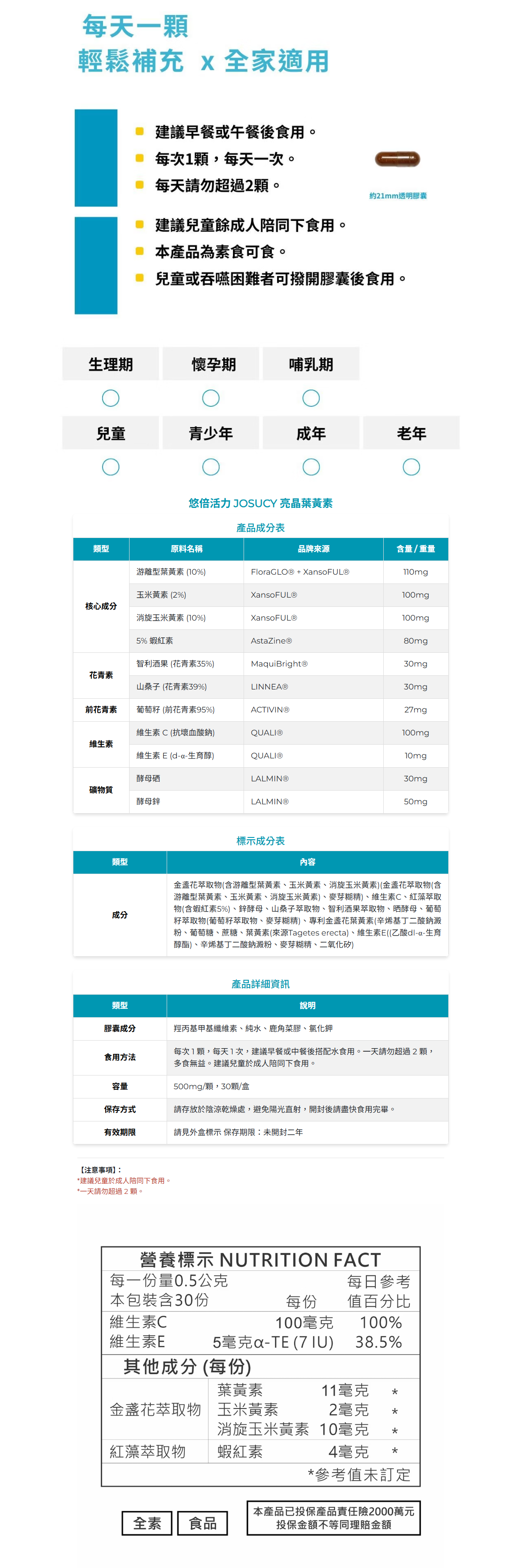 🌟成分|FloraGLO®葉黃素10%、XansoFUL®(葉黃素10%、玉米黃素2%、消旋玉米黃素10%)、AstaZine®蝦紅素(同藻紅素)5%、MaquiBright®智利酒果、Super Antho®山桑子、Activin®葡萄籽、LALMIN®酵母硒、LALMIN®酵母鋅、DSM維生素C、DSM維生素E