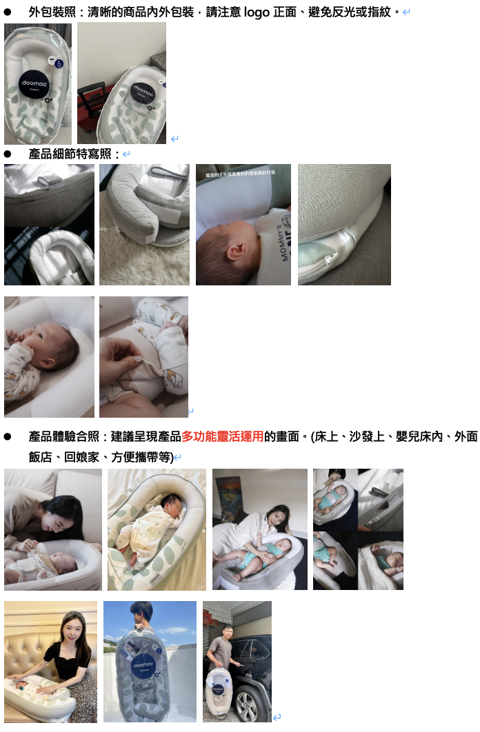 3. 文中如有提及品牌名稱,請正確書寫為「doomoo」,可與使用他牌的寶寶睡窩比較(勿在文章內提及品牌名稱)等使用心得感想,占文章比例50%。