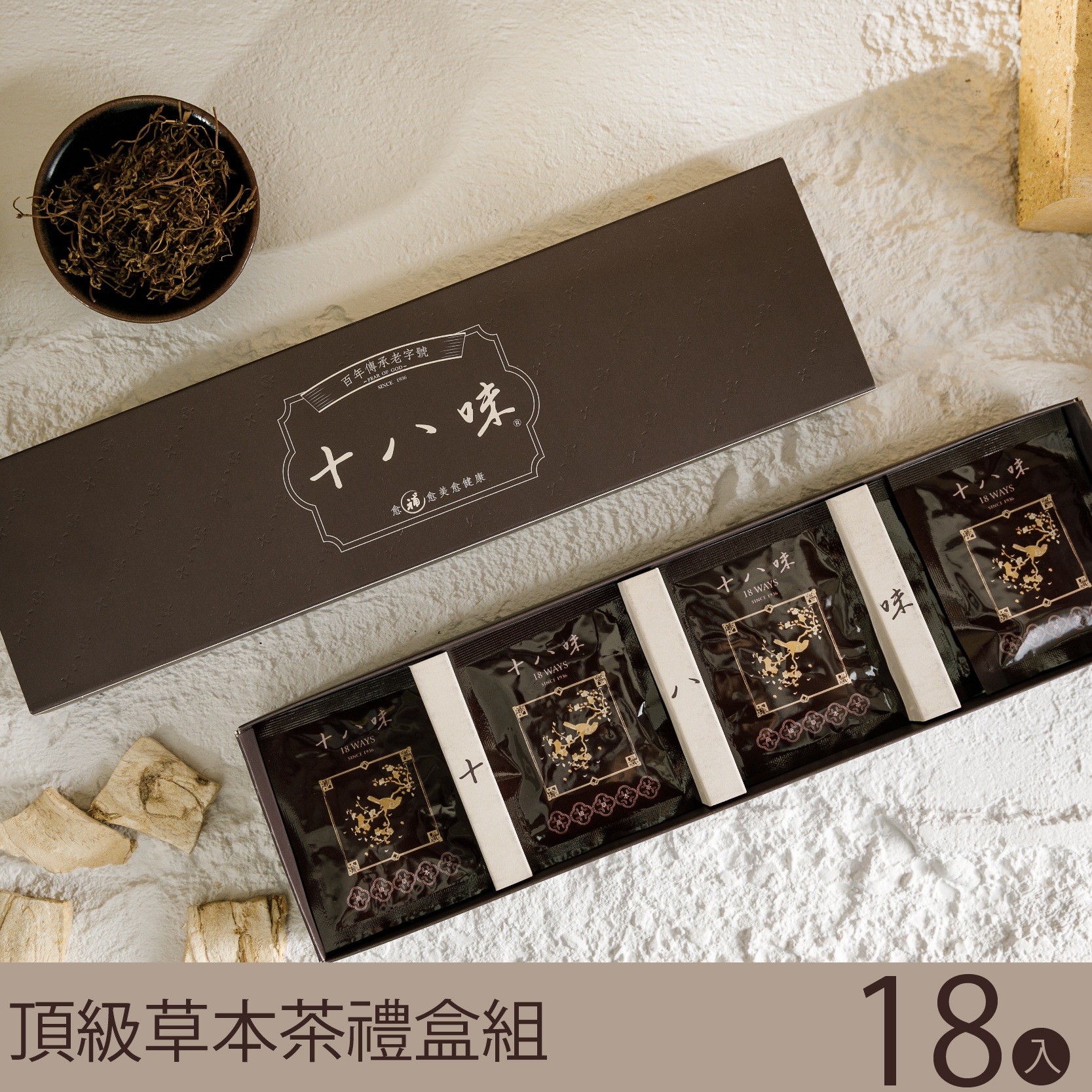 最初供奉於清朝皇室,每個茶包含有十八種好處,由當時的太醫為朝廷特別選配調製