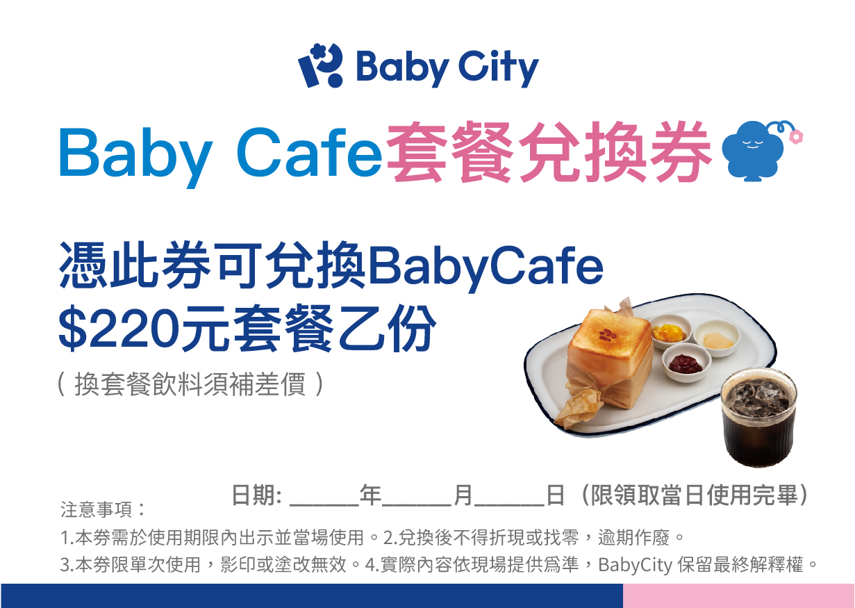 ● 試用產品:Baby City桃園旗艦店-現場商品交換額度$3,000元+2F Baby Cafe吐司磚套餐乙份,價值$220元