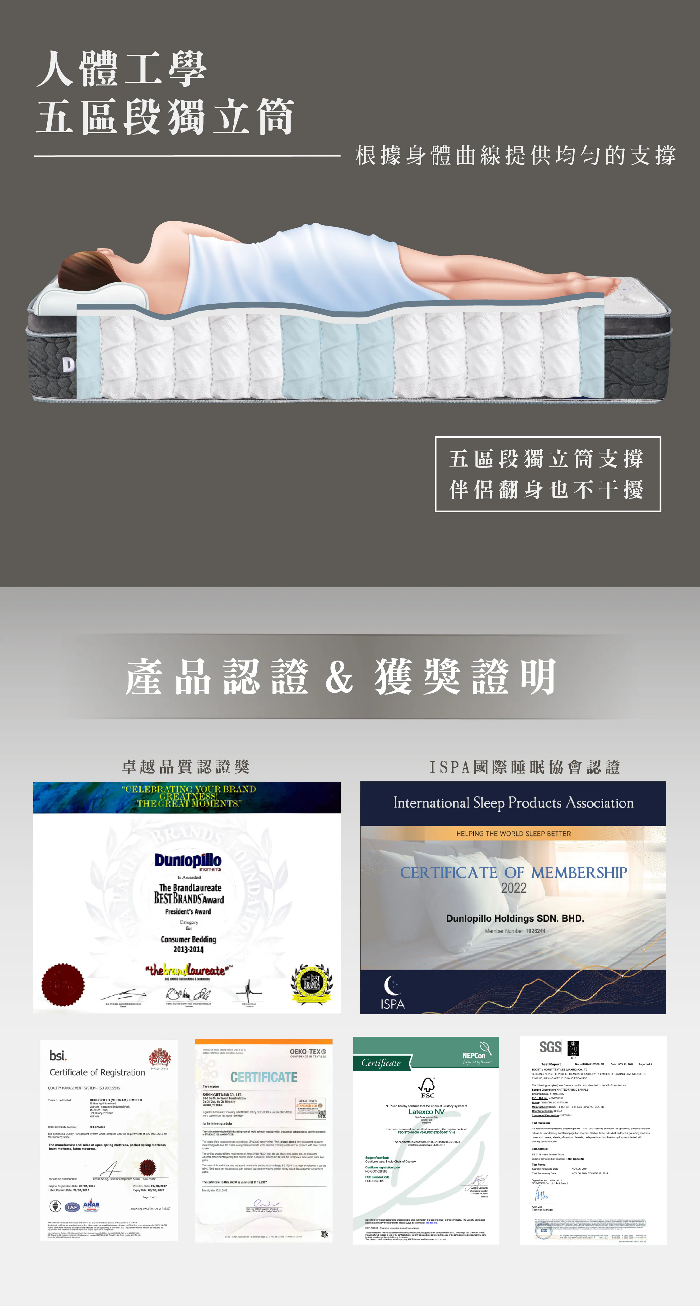 符合人體工學,五段獨立筒提供均勻支撐,伴侶翻身也不干擾