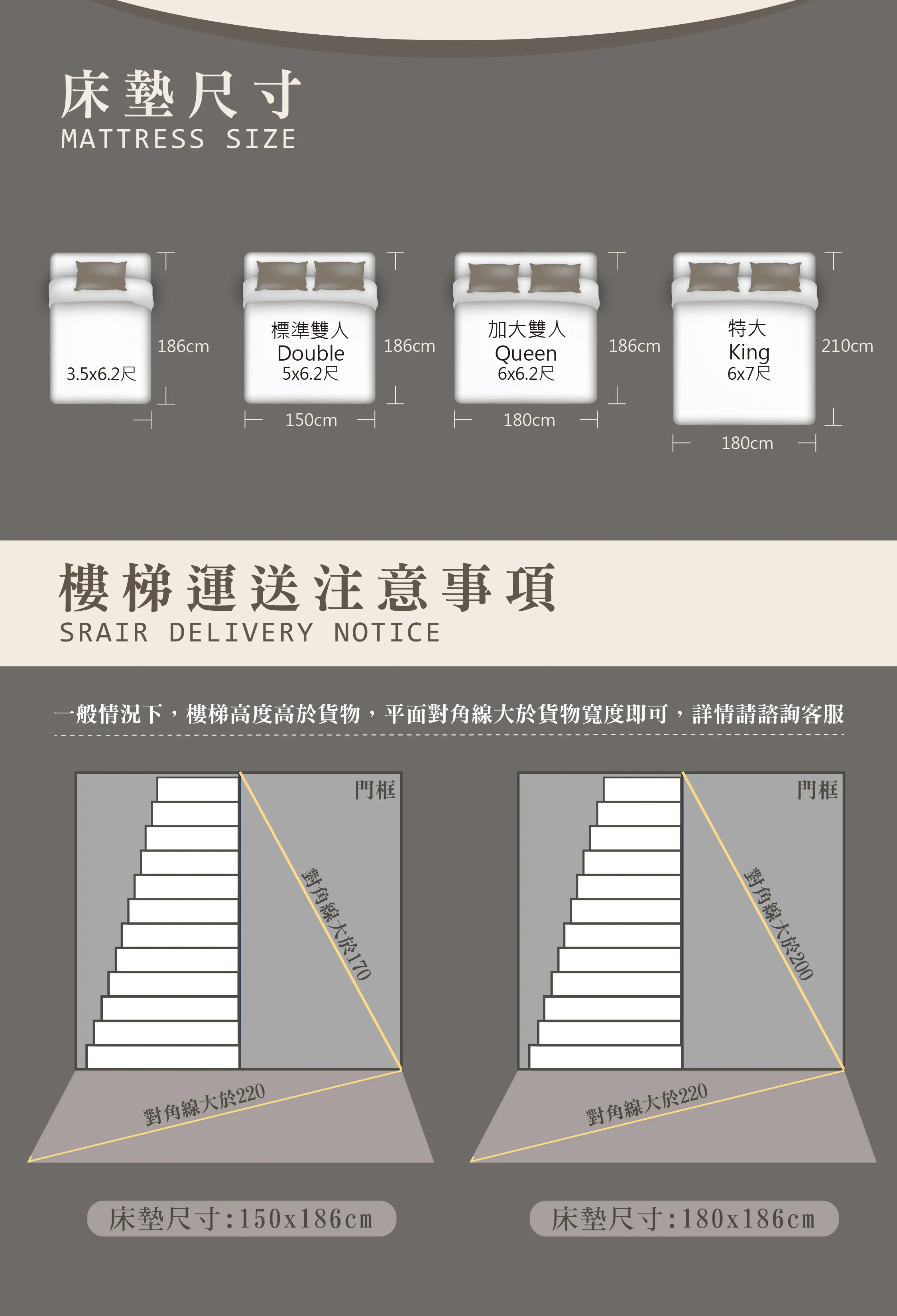 床高37公分,除了標準雙人床尺寸,另有加大單人床、加大雙人床(Queen Size)與特大雙人床(King Size)可選購