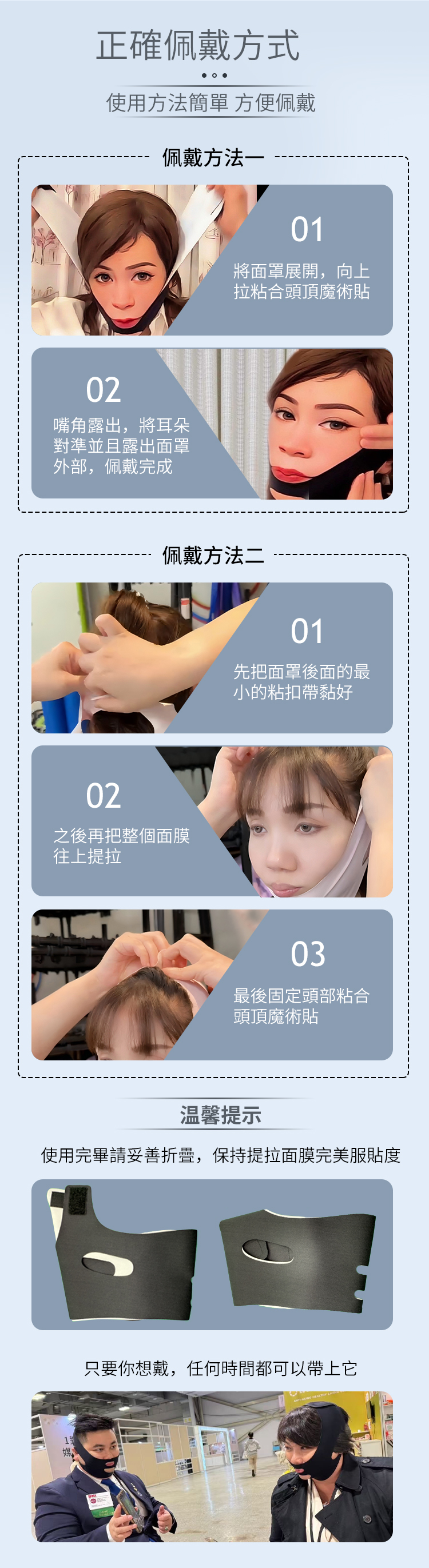 初次使用,緊度勿過,緊建議佩戴15分鐘左右,讓肌膚適應能量薄膜量子波的作用使骨架與臉部線條逐步調整,達到更穩定