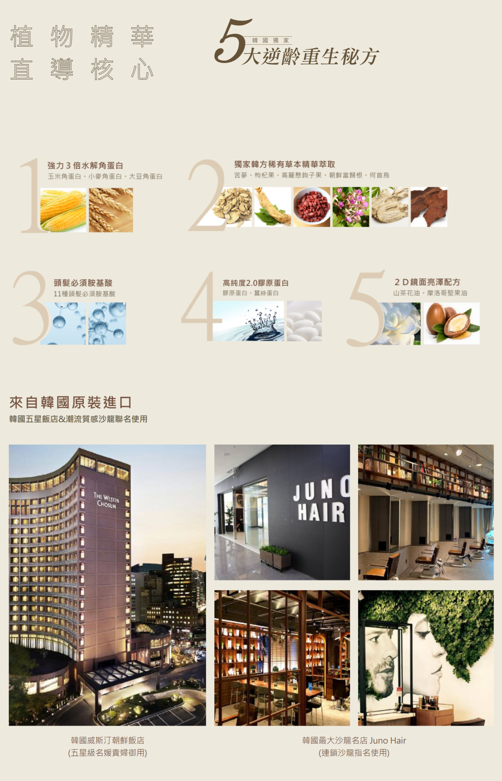 添加珍貴漢方植物:韓國苦蔘、高麗枸杞果、朝鮮當歸根、何首烏等多種草本植物精華,富養髮絲,提供頭髮高效滋補,髮絲集中修護