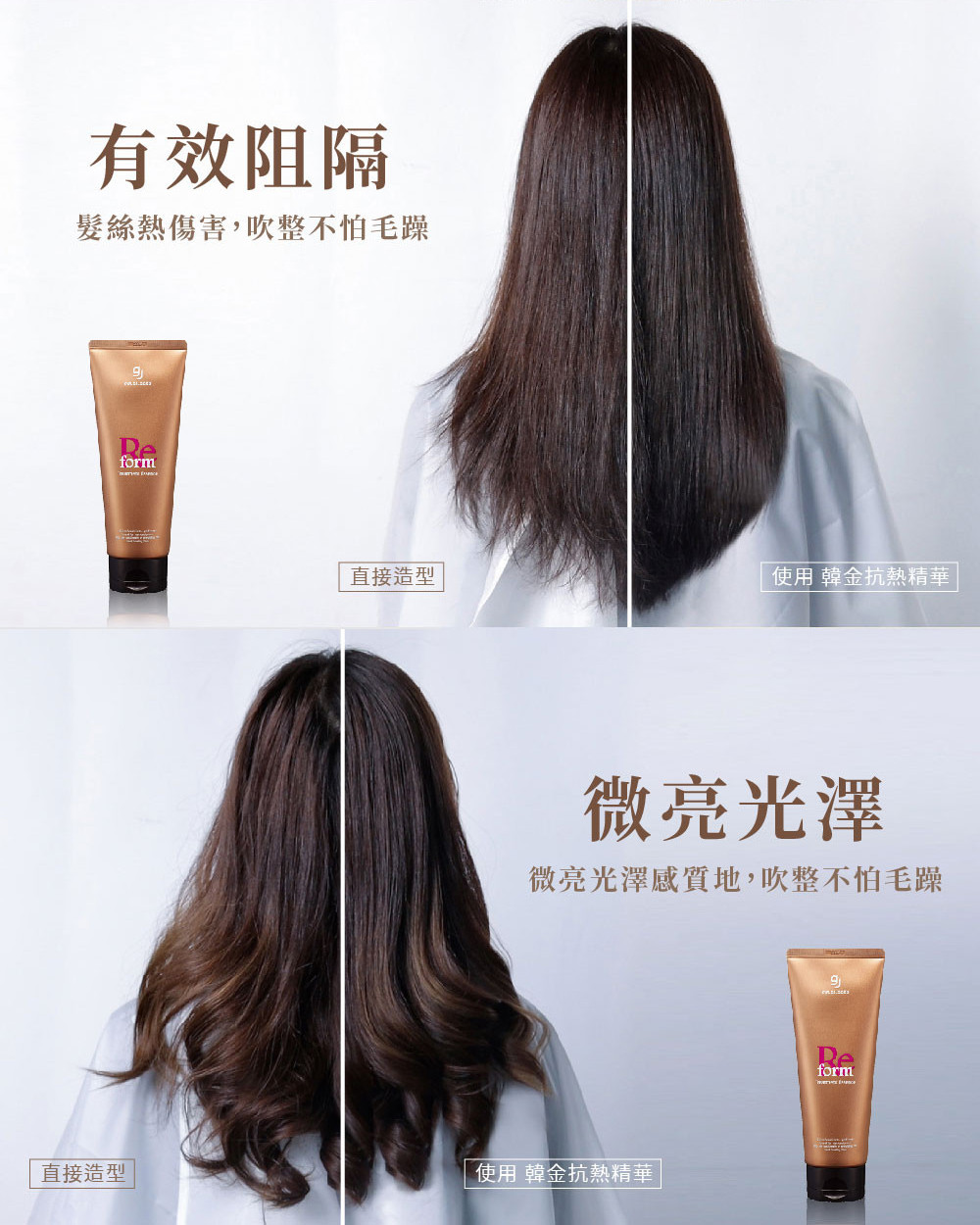 4. 請在照片中帶入完整的使用順序建議: 韓金.修護髮膜(需沖洗) ► 韓金抗熱修護精華(免沖洗),同步搭配文字敘述,比例分配各半即可。