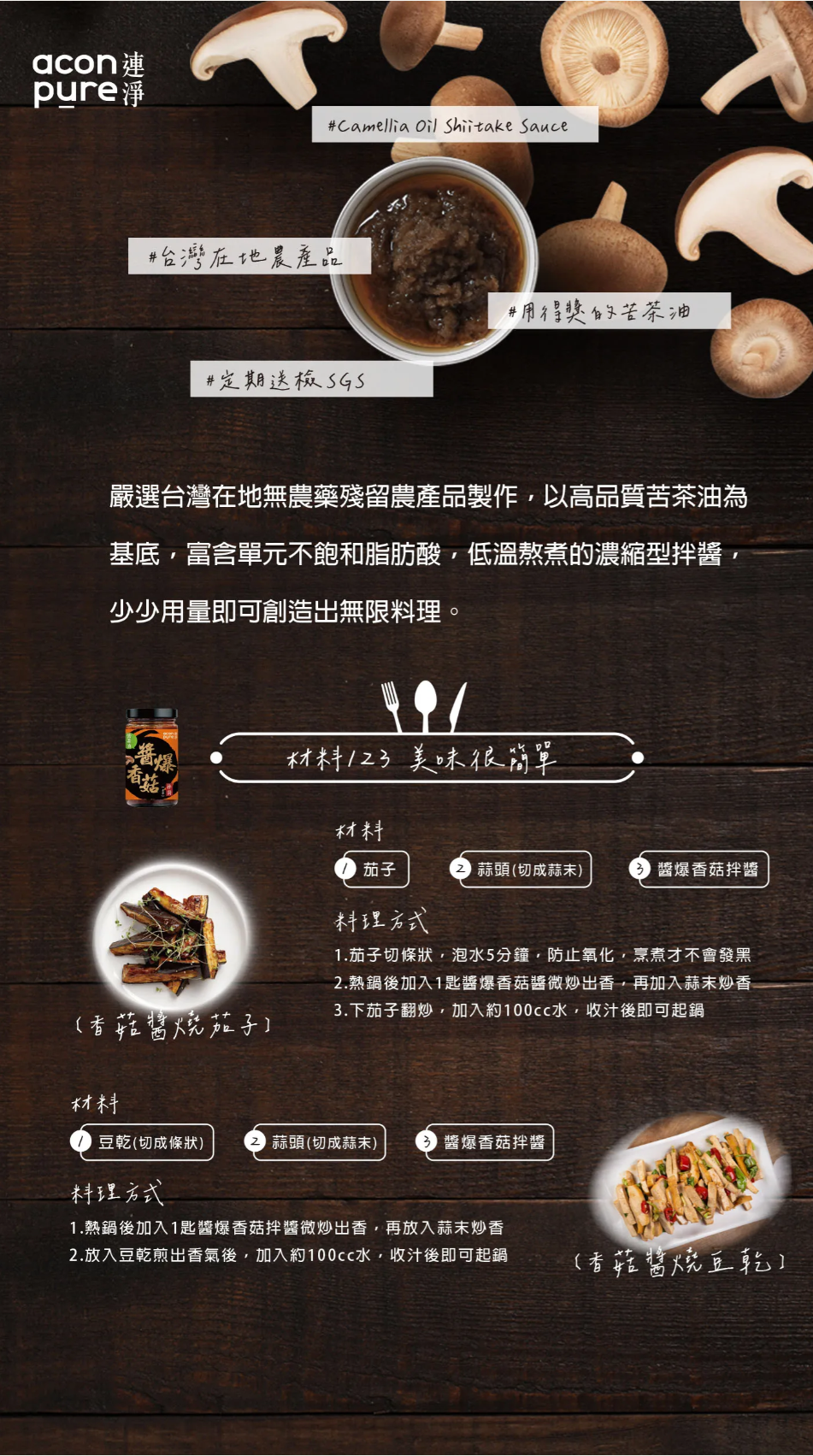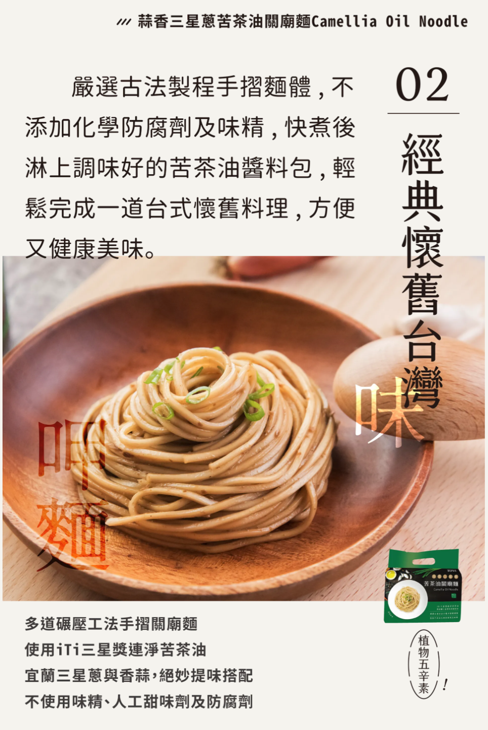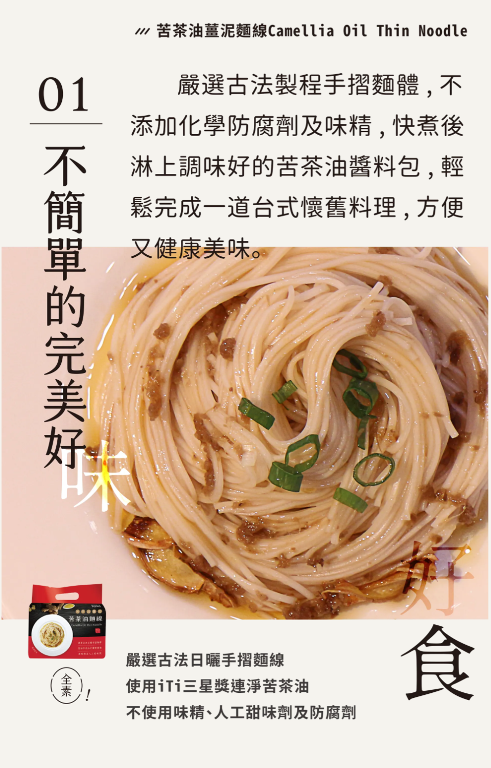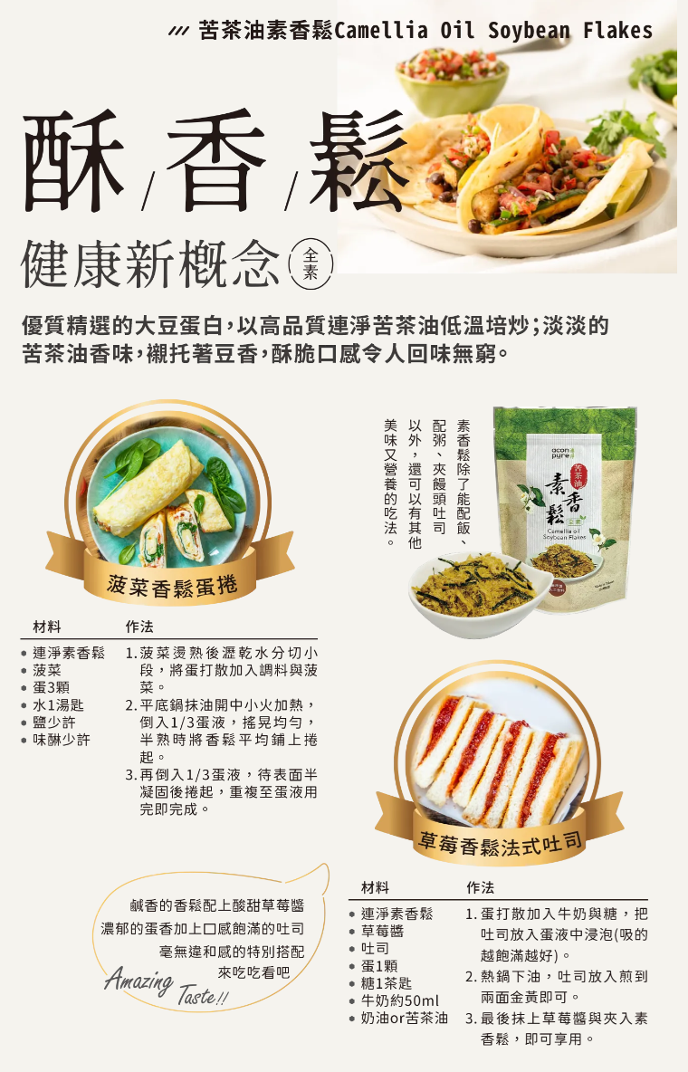 3. 請在文章強調 (1)苦茶油的香氣、味道及特色 (2)產品分別適合如何食用,例如:炒肉片、沾醬、拌麵、拌飯等 (3)苦茶油的製作工法 (4)麵條的口感及口味,適合加入什麼配菜 (5)拌醬的香氣、成分 (6)鍋物的食用時機,及內部原先的配料就很豐富 (7)香鬆或肉燥的使用時機,並強調素食者可食用。(請多多發揮創意分享食譜唷!)