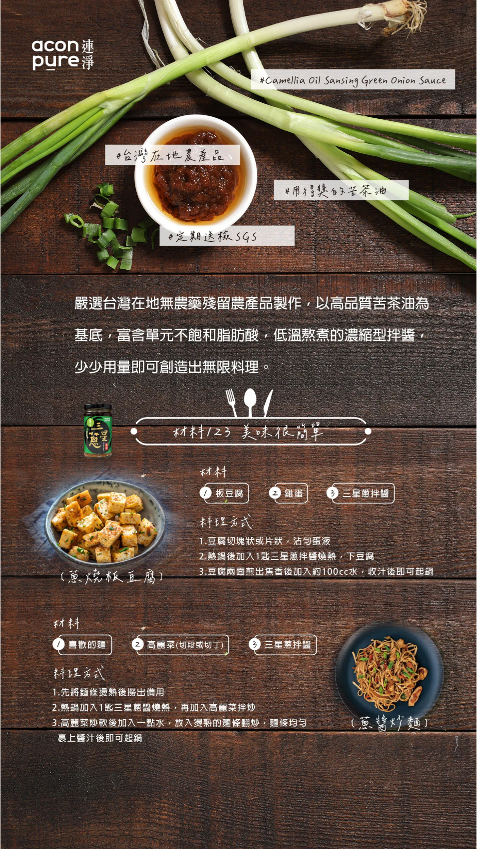 苦茶油三星蔥拌醬(植物五辛素)選用台灣無農藥三星蔥與得獎苦茶油,低溫熬煮濃縮呈現,富含單元不飽和脂肪酸,是健康拌麵醬首選,通過SGS檢驗。
