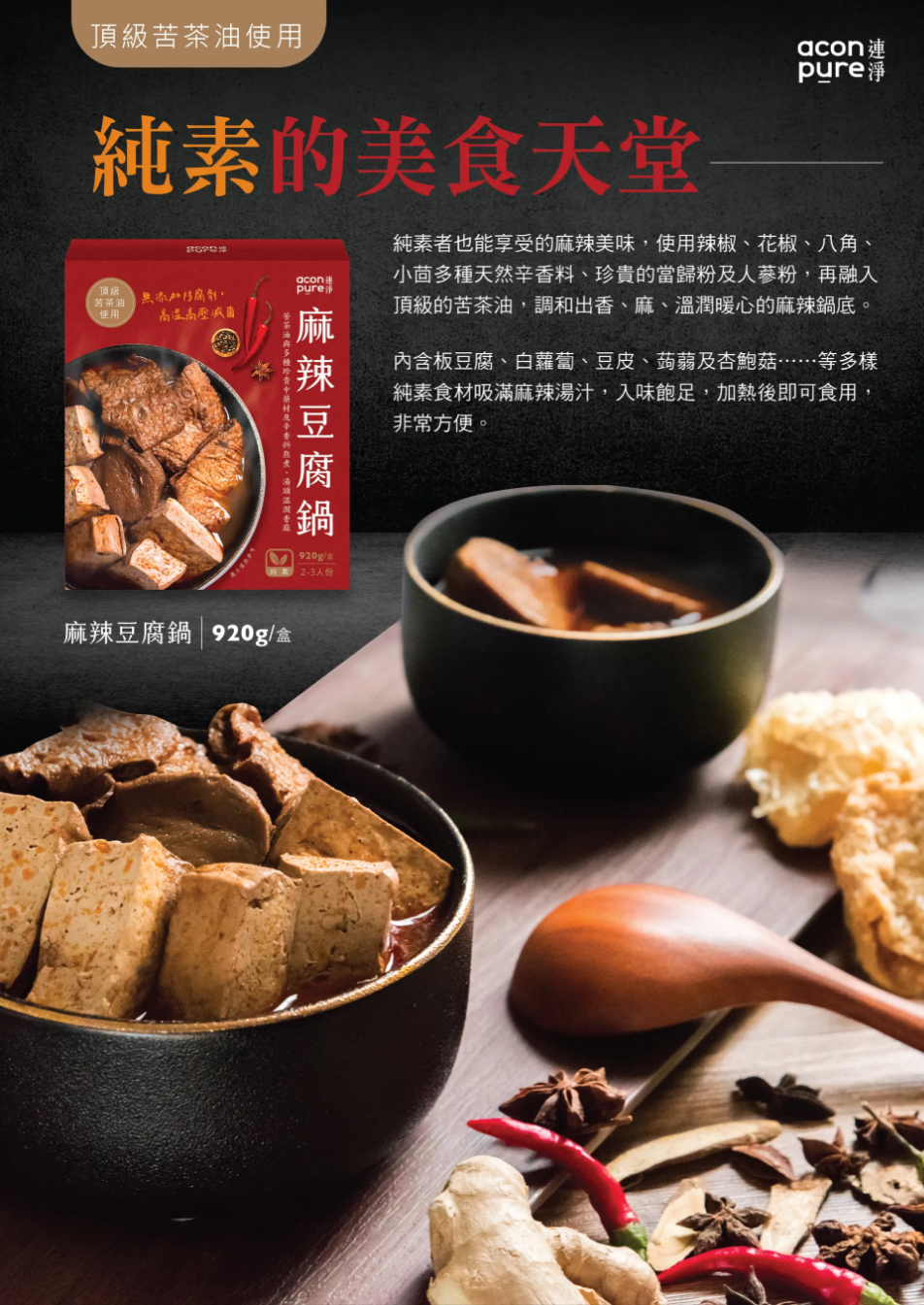 麻辣豆腐鍋(全素),選用苦茶油,辣椒、花椒等辛香料,打造溫潤香麻的麻辣豆腐湯底。內含多樣純素食材,方便即食,是最理想的麻辣豆腐調理包首選。
