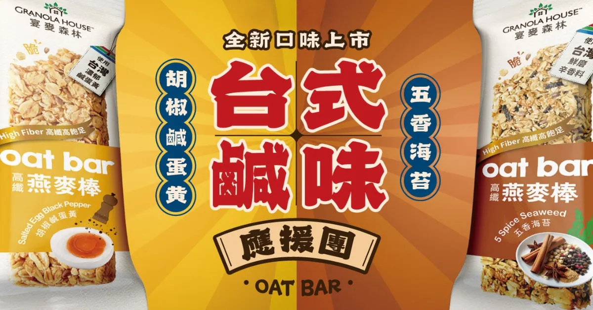 此次推出的新品為鹹蛋黃燕麥棒與五香海苔燕麥棒,靈感源自台灣人熟悉的傳統古早味糕餅,且皆使用天然原料調味,保留燕麥的飽足口感。「鹹蛋黃燕麥棒」以屏東的國寶鴨鹹蛋黃與胡椒鹹味打造濃郁層次;「五香海苔」則以清爽鹹香呈現溫和口感。小條便攜的設計,適合作為早餐、運動補給或工作間隙的輕食選擇,深受追求飲食控制與健康生活的族群青睞。
