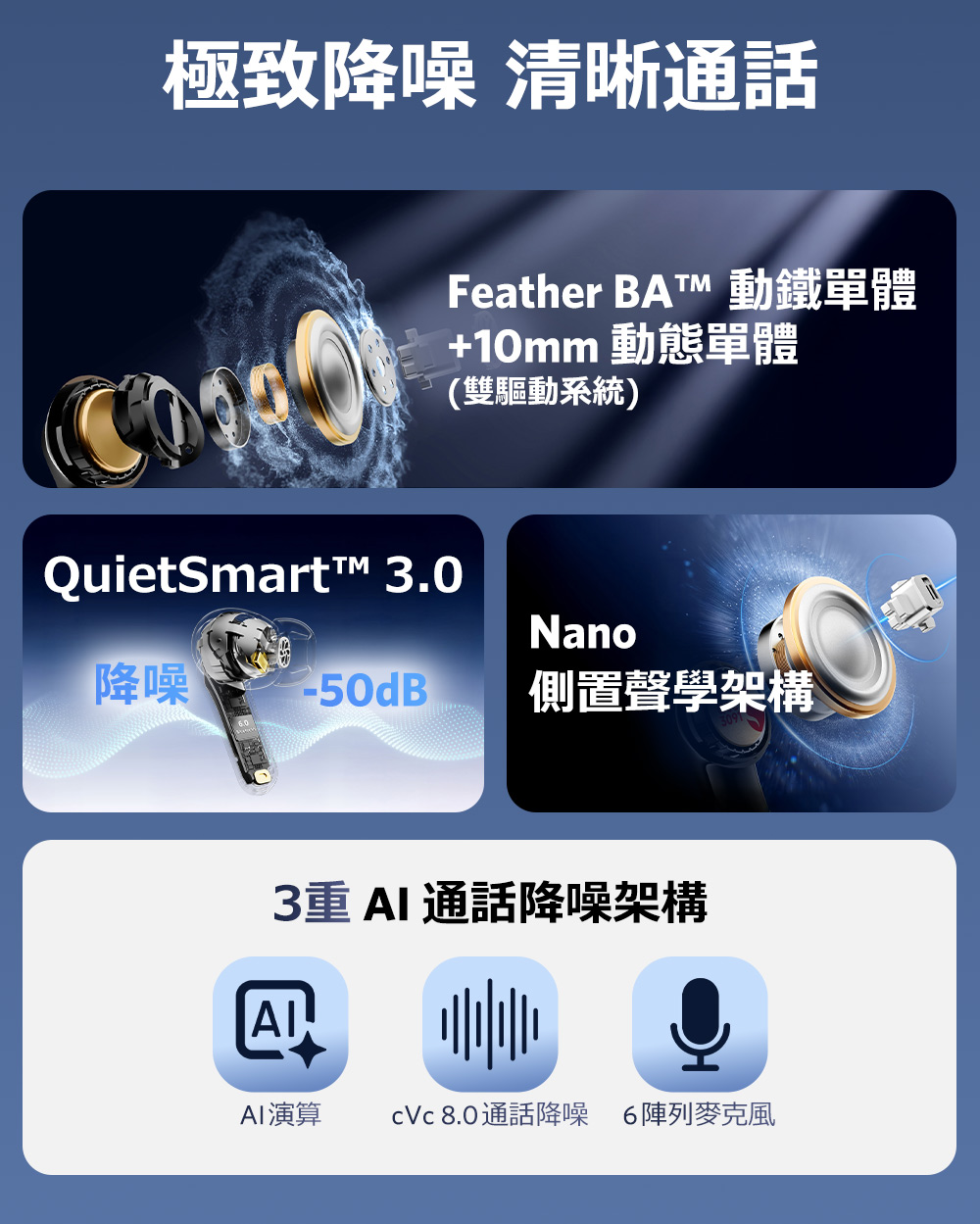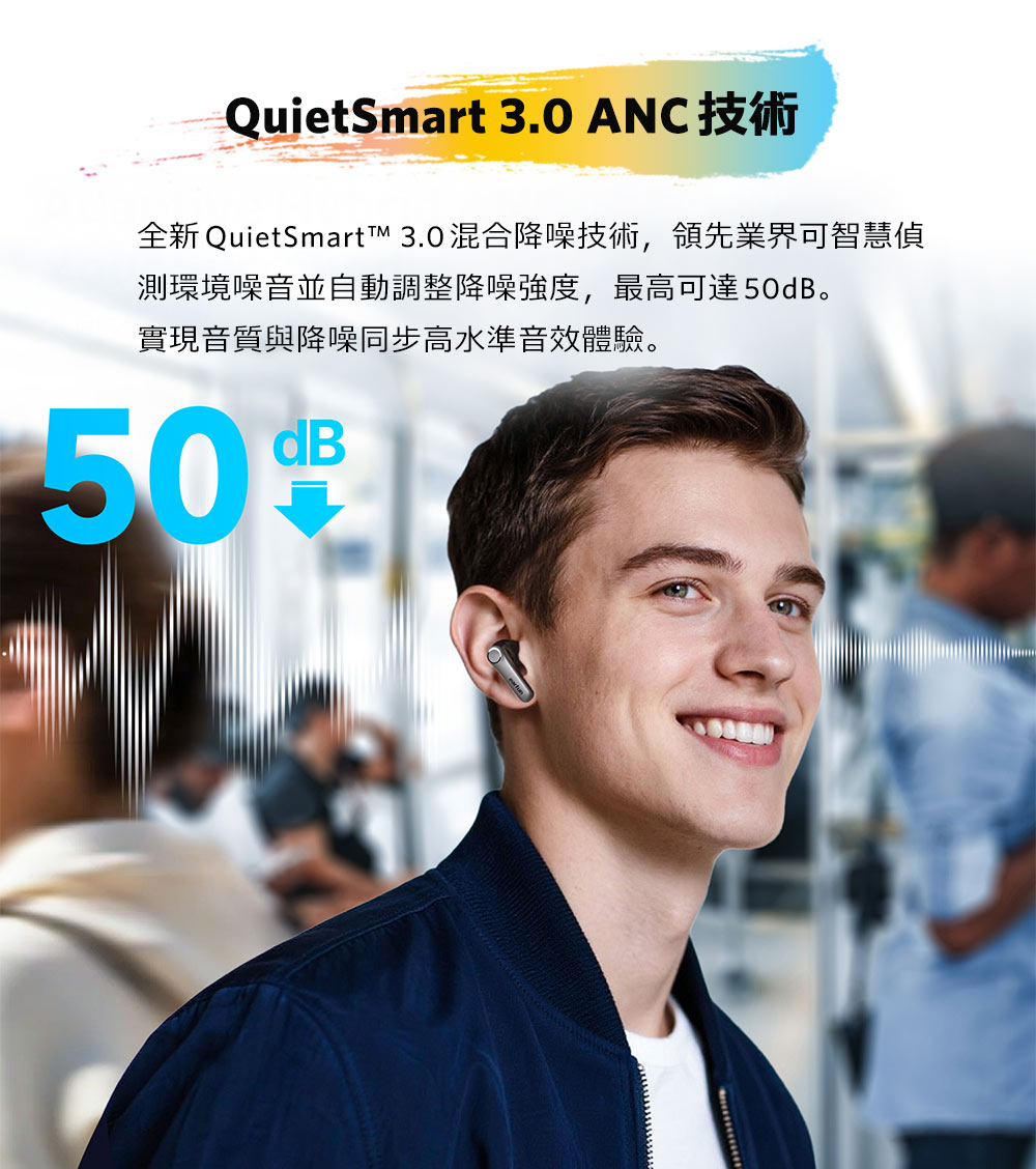 • 頂級降噪|QuietSmart 3.0 自適應降噪高達 50dB
