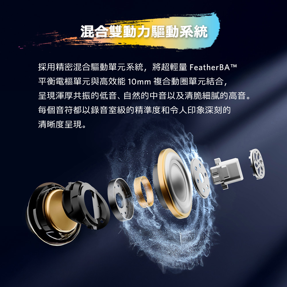 • 驅動單體:FeatherBA™ 動鐵單體+10mm 動圈單體