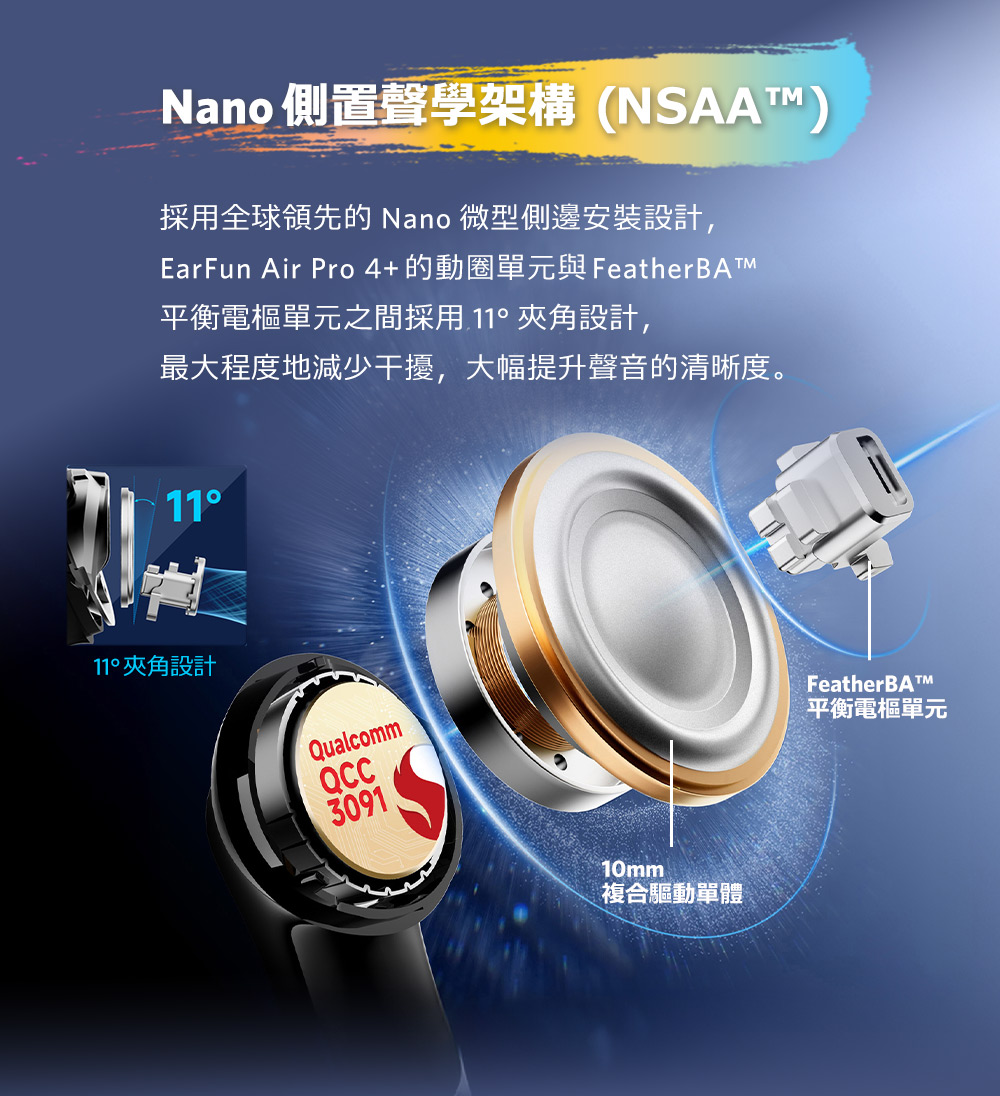 ⚡混合雙單體超輕量動鐵+10mm動圈單體、採用全球領先的Nano微型側置聲學架構(最大程度減少干擾,大幅提升音質清晰度)、最新Snapdragon音頻連線技術、採用最新高通晶片、LDAC編碼、Hi-Res 認證白金音質、藍牙6.0、降噪高達50dB、AI演算+升級版6麥克風陣列+cVc 8.0技術通話更清晰、單次電力12小時搭充電盒總續航54小時、快充10分鐘可用3小時、<50ms超低延遲遊戲模式、APP客製化設定、支援多點連線。(提供參考,請結合自己的文筆敘述)