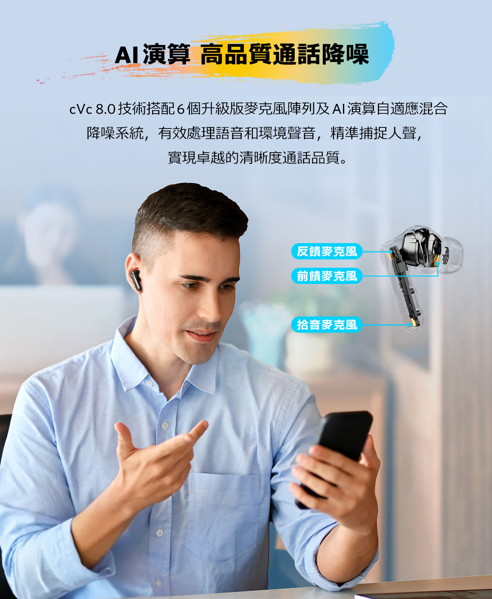 • 通話降噪|AI演算+升級版6麥克風陣列+cVc 8.0技術