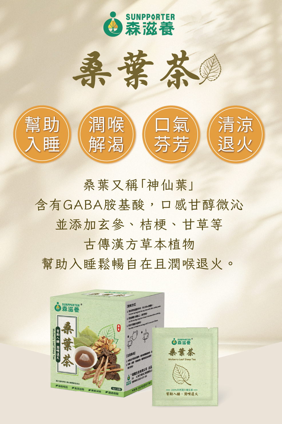 ● 「桑葉茶」建議使用文字:桑葉/幫助入睡/GABA天然胺基酸/潤喉解渴/清涼退火