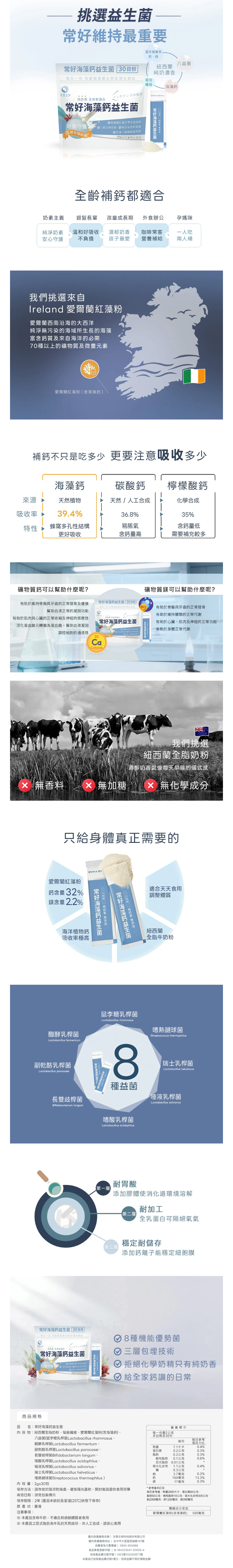 5. 產品特色可自然融入描述,例如:結合8種機能優勢菌、愛爾蘭天然海藻鈣的雙效補給設計、海藻鈣蜂窩多孔結構的吸收特性、三層包埋技術帶來的穩定性、紐西蘭全脂奶粉的濃醇口感與無添加設計,請以個人口吻改寫呈現,不要直接複製官網文字喔。