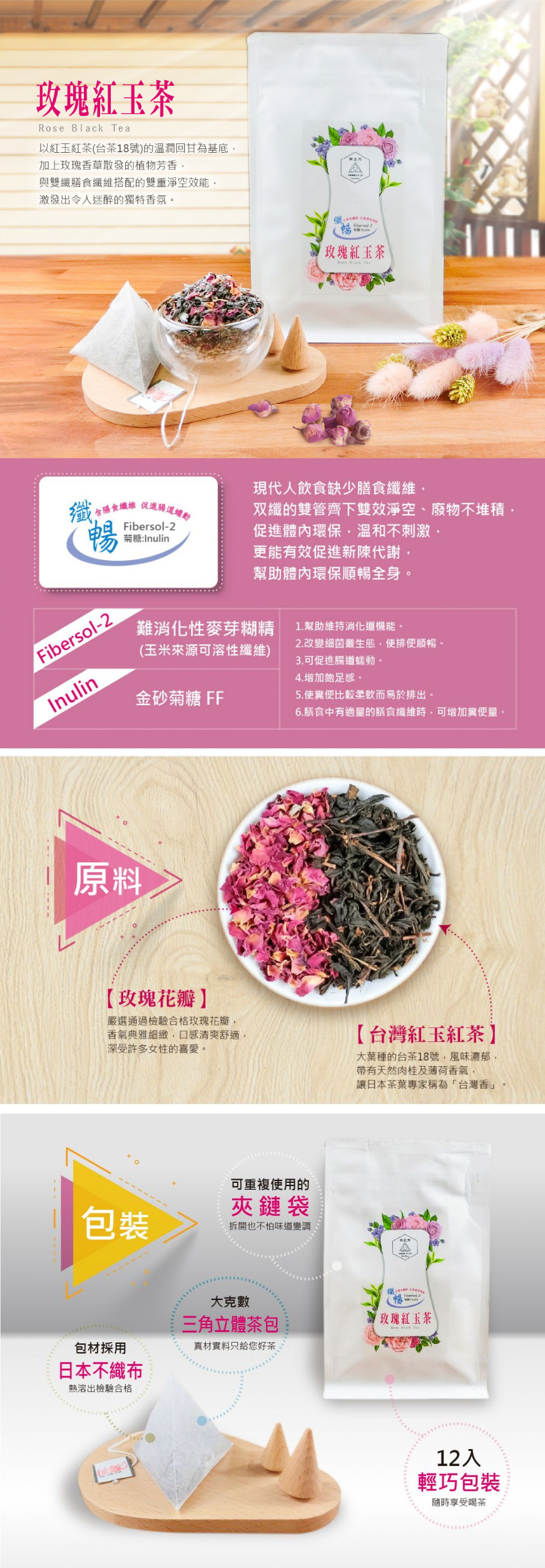 纖暢玫瑰紅玉茶以紅玉紅茶(台茶18號)的溫潤回甘為基底,搭配玫瑰香草植物的芳香搭配雙纖膳食纖維搭配出雙效淨空,廢物不堆積,促進體內環保溫和不刺激、促進消化新陳代謝、去油解膩、順暢全身。,這纖暢玫瑰紅玉茶激發出令人迷醉的獨特香氛。