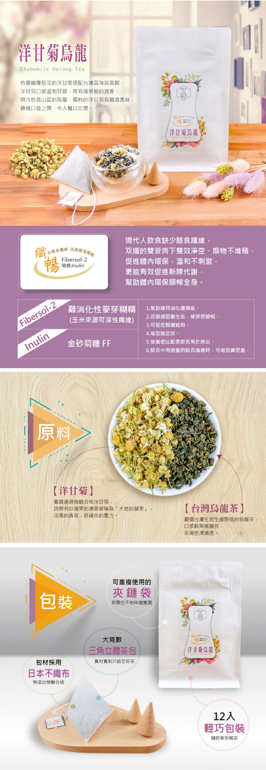 纖暢洋甘菊烏龍特選幽雅恬淡的洋甘菊,搭配台灣高海拔烏龍,加上現代人飲食缺少膳食纖維,双纖的雙管齊下雙效淨空、廢物不堆積,促進體內環保溫和不刺激更能有效促進新陳代謝與洋甘菊口感溫和甘甜,帶有蘋果般的清香,與冷悠高山區的烏龍,獨特的洋甘菊烏龍清香味,繚繞口齒之間,令人難以忘懷。