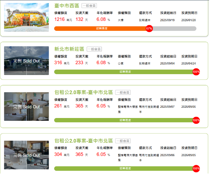 ✅投資標的種類分為不動產抵押擔保債權、租賃契約擔保債權,例如公寓、整棟大樓套房等等