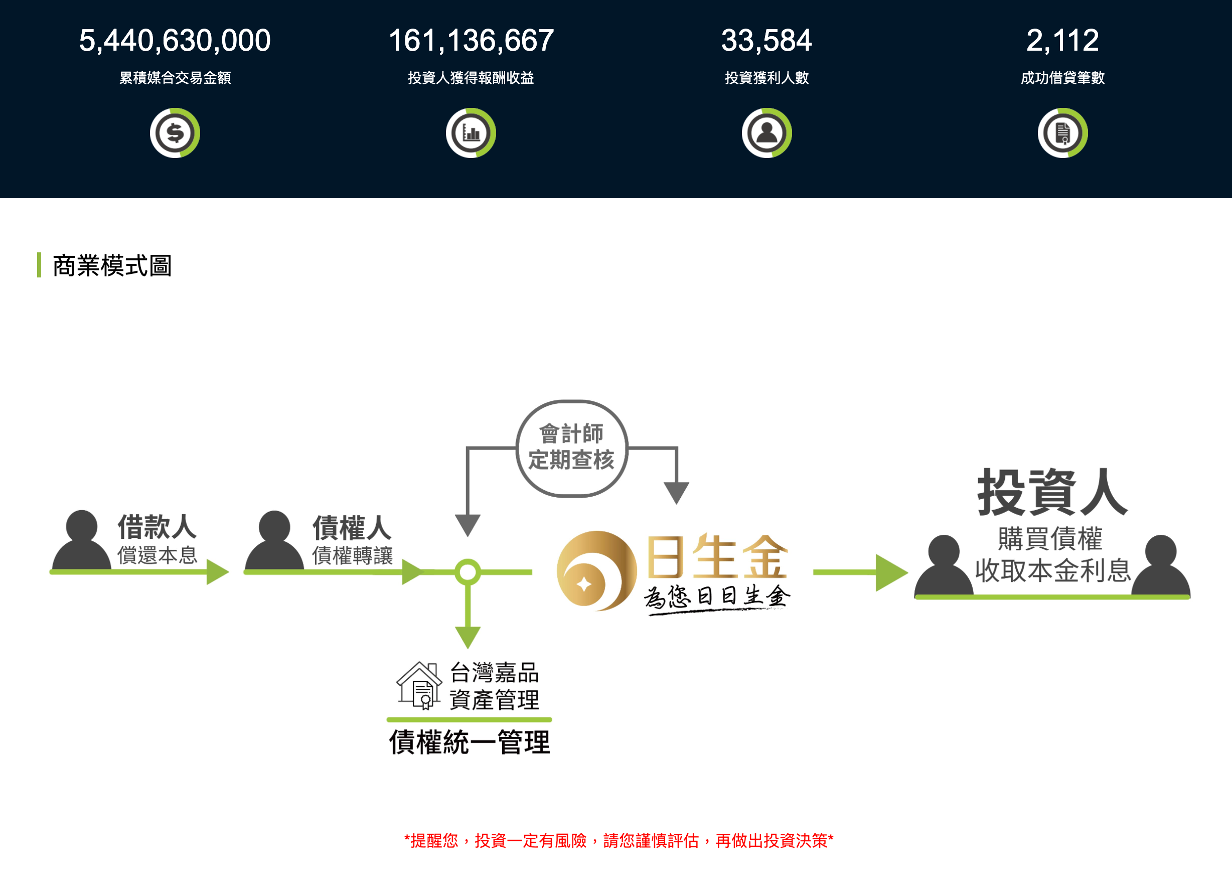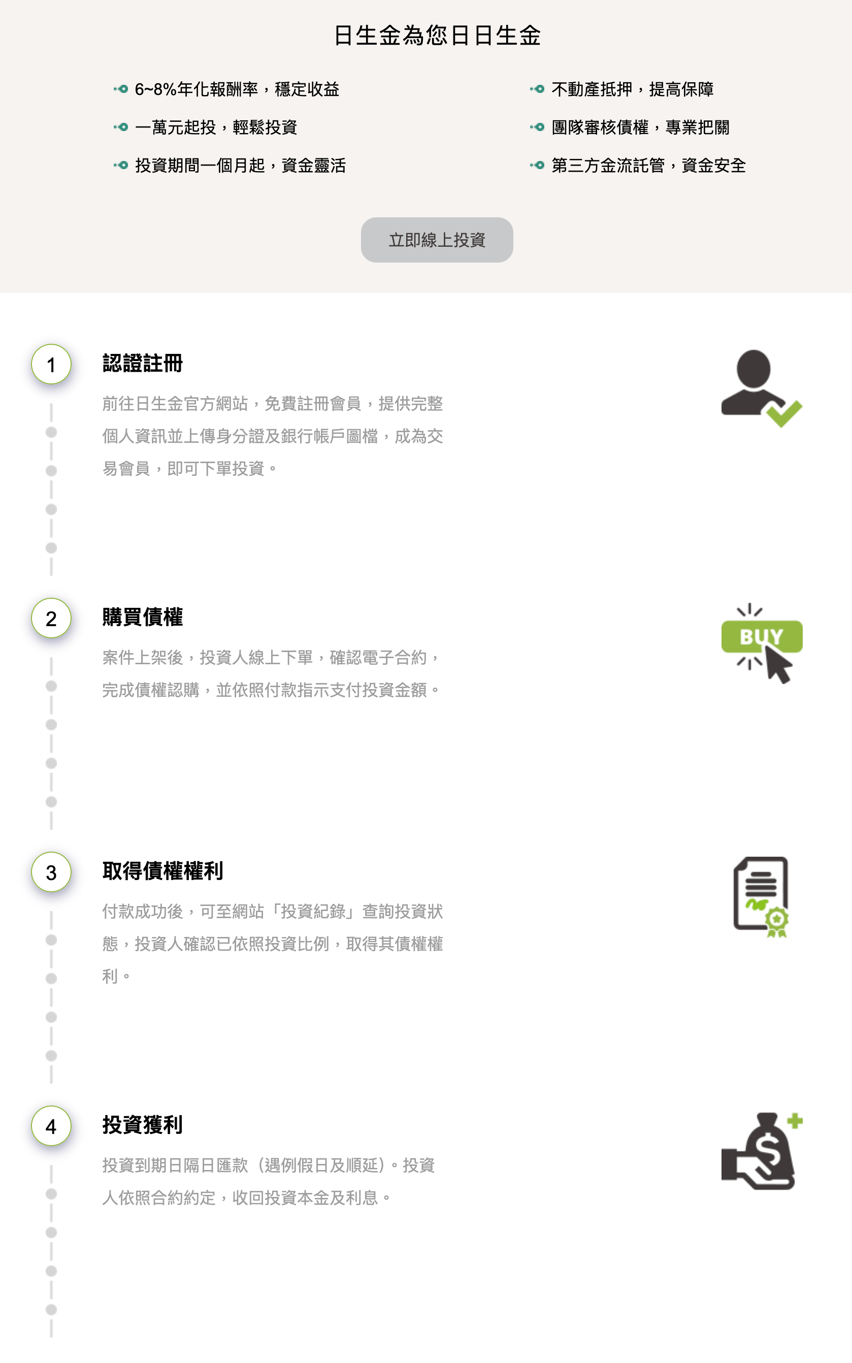 日生金是媒合債權讓與人與投資人的中介平台,並無法保證債務人違約時投資款能完全回收,若債務人違約,日生金將配合專業人士(如律師、地政士等)為您辦理債權保全程序,以達成讓您順利投資安全獲利的任務。