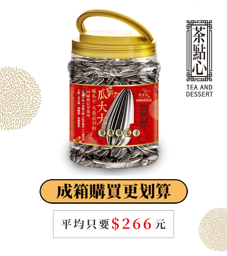 ● 試用產品:瓜大大茶煮葵瓜子*1罐(660G),價值$330元