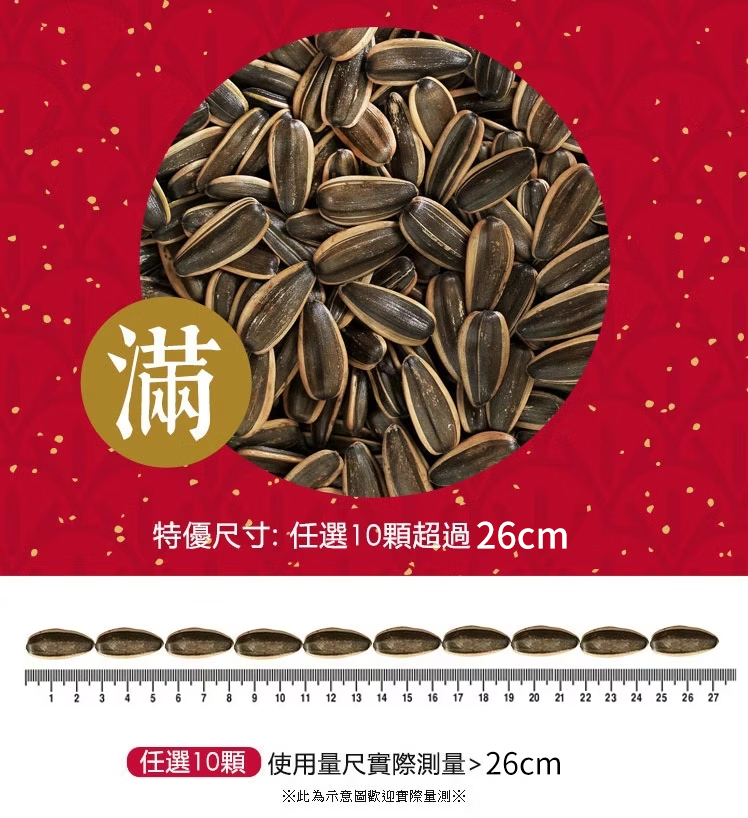 4. 照片請包(1)人與產品的合照(2)包裝外觀(3)隨機抓10顆瓜子,以尺進行測量 (4)瓜子1顆展示畫面,可與10元硬幣做對比(5)美味食用情境照、情境擺拍照等,使用濾鏡請留意色差,不得與原色相差太多!照片勿模糊失真,避免品牌名左右相反。(有小短片會大加分!)