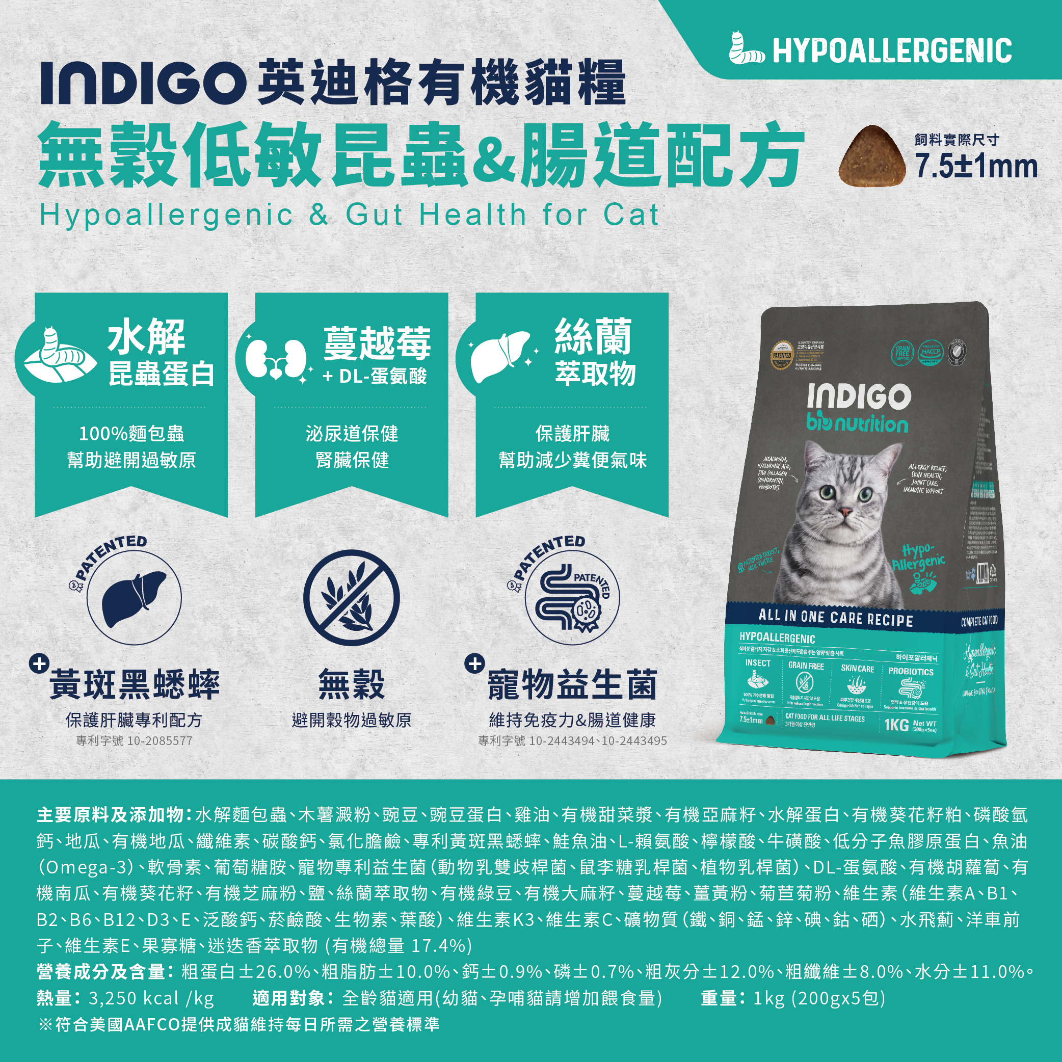 📍INDIGO 英迪格有機飼料 貓用 無穀低敏昆蟲&腸道配方(給極易過敏的貓吃) 1kg 二包