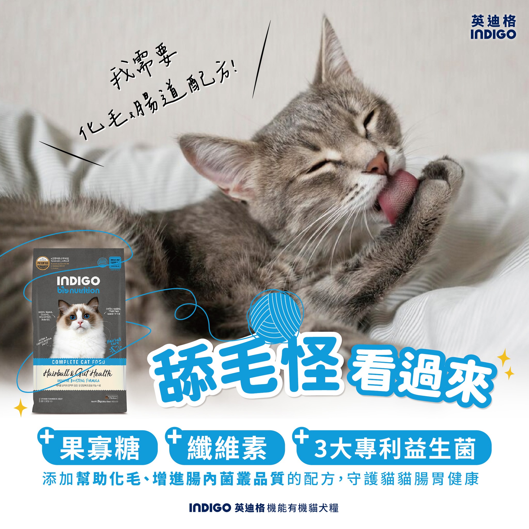 📍INDIGO 英迪格機能有機飼料 化毛&腸胃配方 貓用 2kg 一包